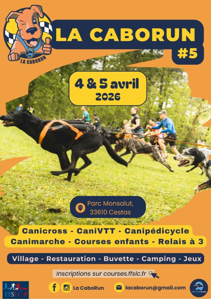 La Caborun #5 est un événement sportif convivial autour des activités canines, qui se déroulera les 4 et 5 avril 2026 au Parc Monsalut à Cestas. Au programme : canicross, caniVTT, canipédicycle, canimarche, courses pour enfants et relais à 3.