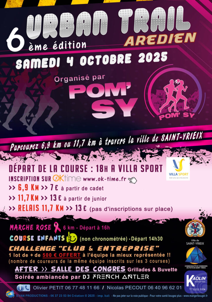 Retrouvez la 6 ème édition de l’Urban Trail Arédien le samedi 4 octobre 2025, un événement organisé par le club de running Pom’Sy.
